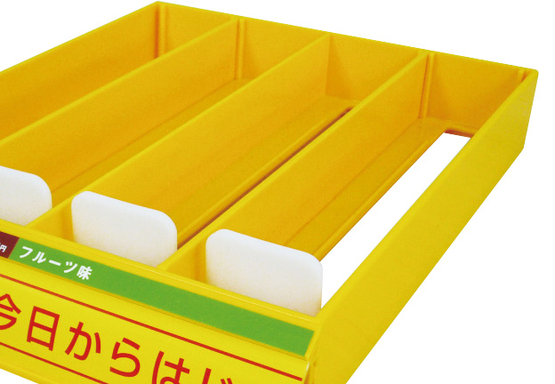 大手製薬メーカー様のカウンター展示台です。仕切りが可動式で2ヶパック用と4ヶパック用を兼用できる什器です。